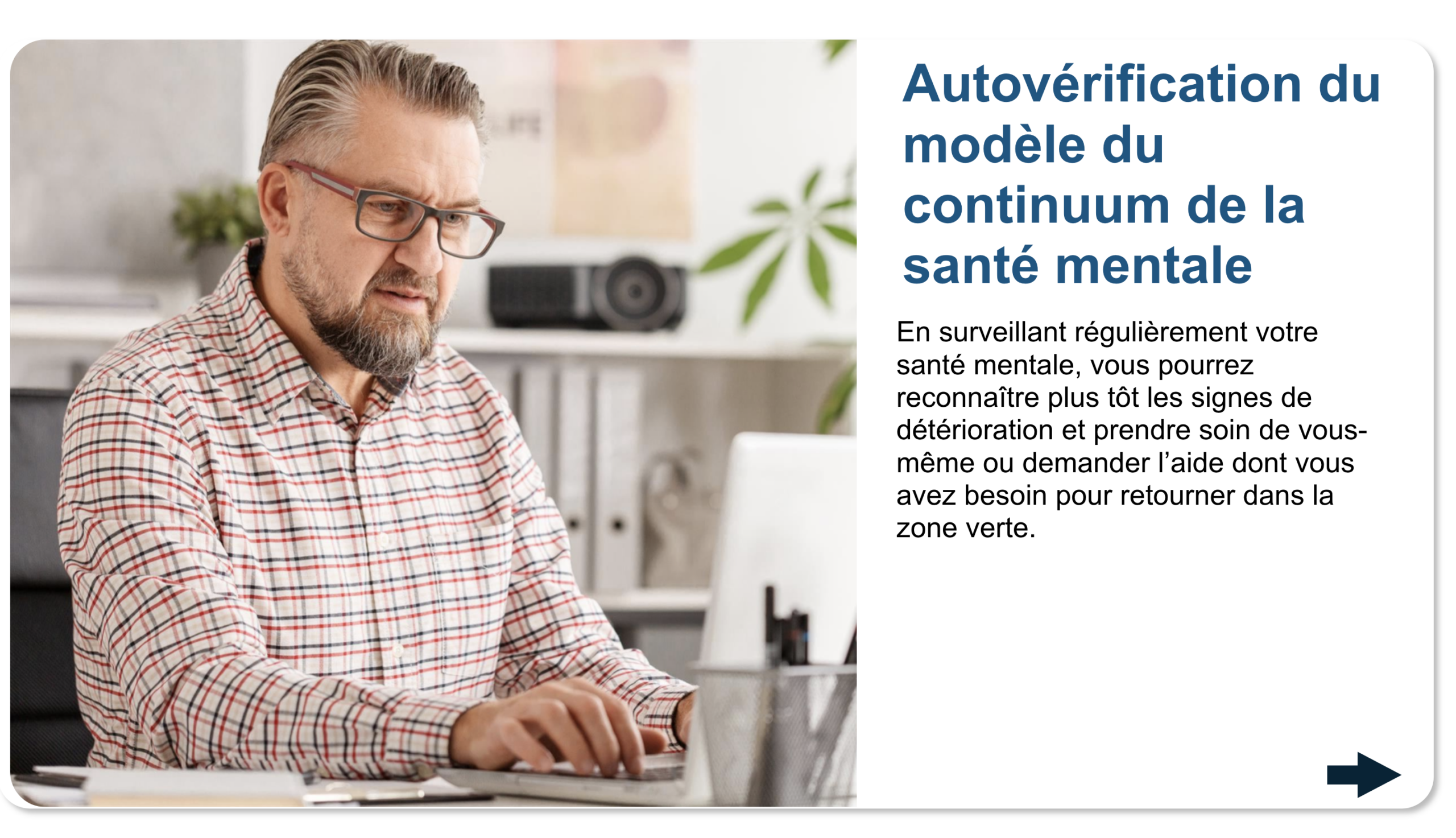 N’oubliez pas que la surveillance régulière de votre santé mentale est une étape importante. Cependant, si vous constatez une détérioration, vous pouvez consulter d’autres sections de ce site Web, telles que Comprendre le stress, Prendre soin de soi et Résilience individuelle, pour vous aider.