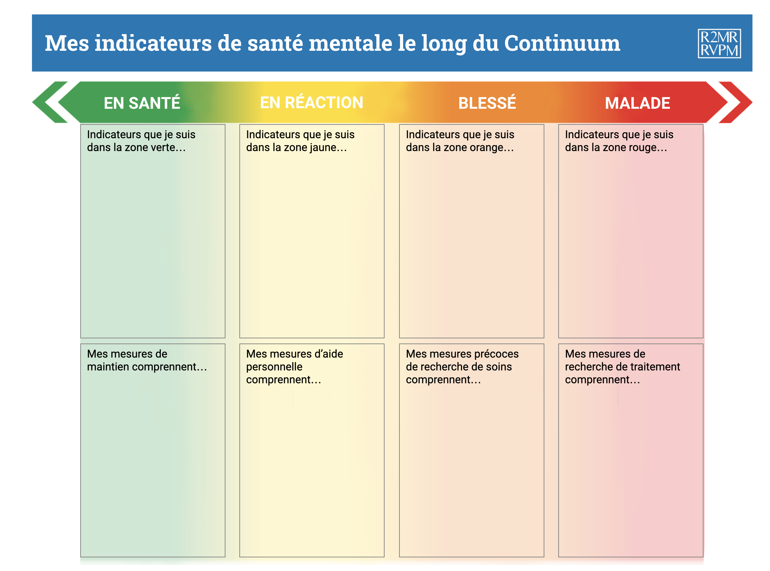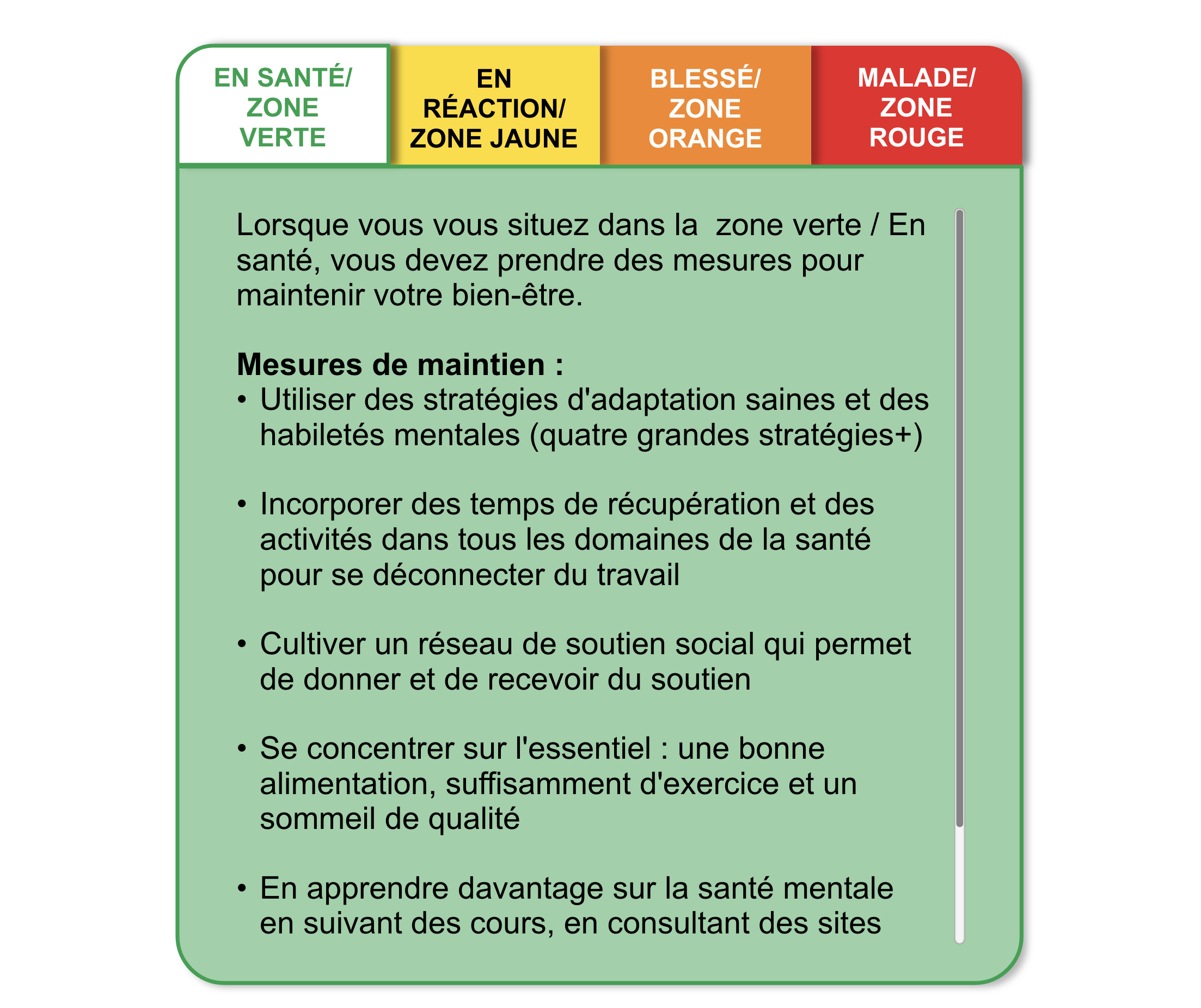 À l’aide du modèle ci-dessous, prenez un moment pour identifier vos comportements qui correspondent aux indicateurs de chaque zone du continuum (zone verte / En santé, zone jaune / En réaction, zone orange / Blessé, zone rouge / Malade). Vous allez inclure des signes dans n’importe quel domaine (humeur, performance, sommeil, bien-être physique, bien-être social, bien-être spirituel, dépendances) où vous observez que vos comportements correspondent aux indicateurs de la zone pertinente.
